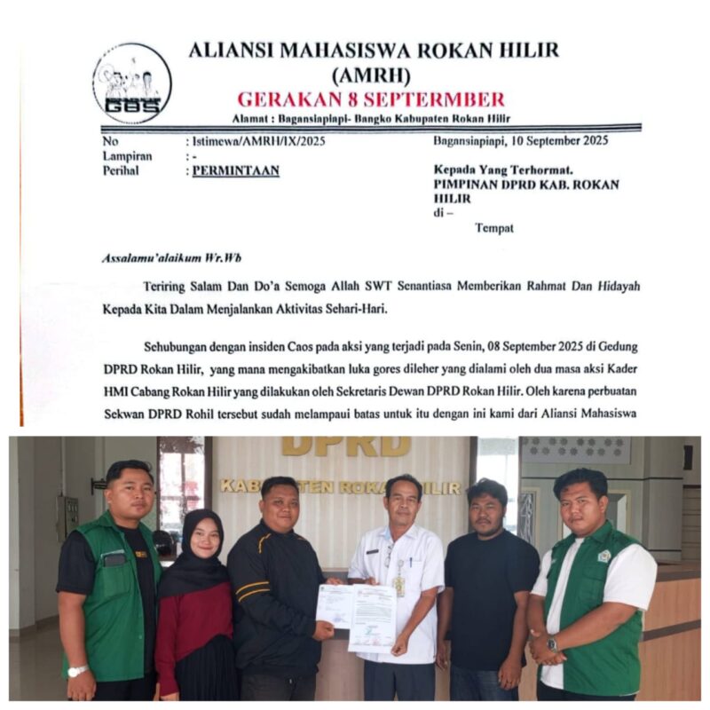 Permintaan kami diatas, tidak hanya disampaikan lewat media. Permintaan kami juga telah di sampaikan secara tertulis, melalui surat resmi atas nama Aliansi Mahasiswa Rokan Hilir (AMRH) yang ditujukan kepada Pimpinan DPRD Rokan Hilir dengan Nomor Surat : Istimewa/AMRH/IX/2025 perihal : Permintaan yang dibuat dan disampaikan langsung pada Rabu (10/09/2025). beber Eka